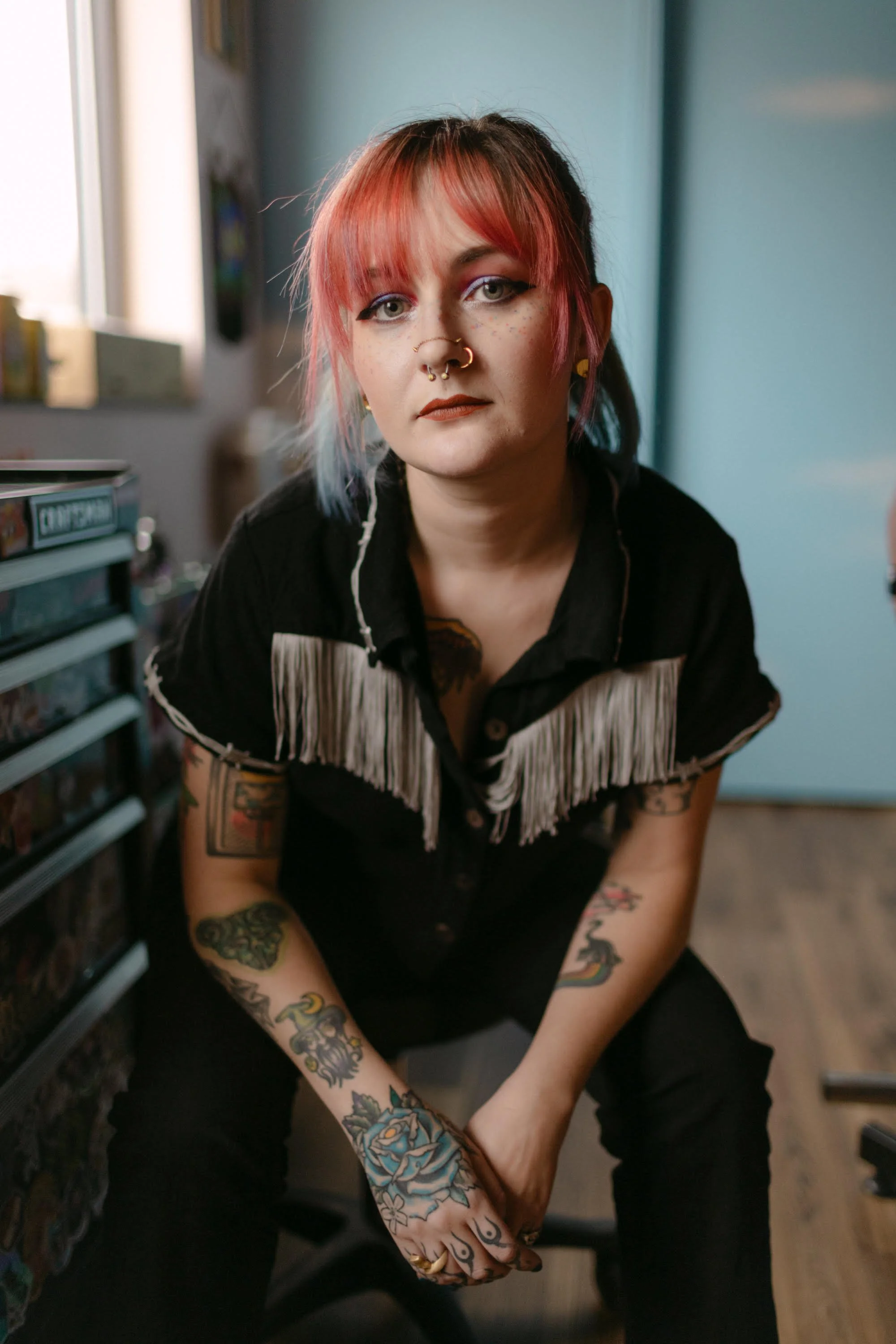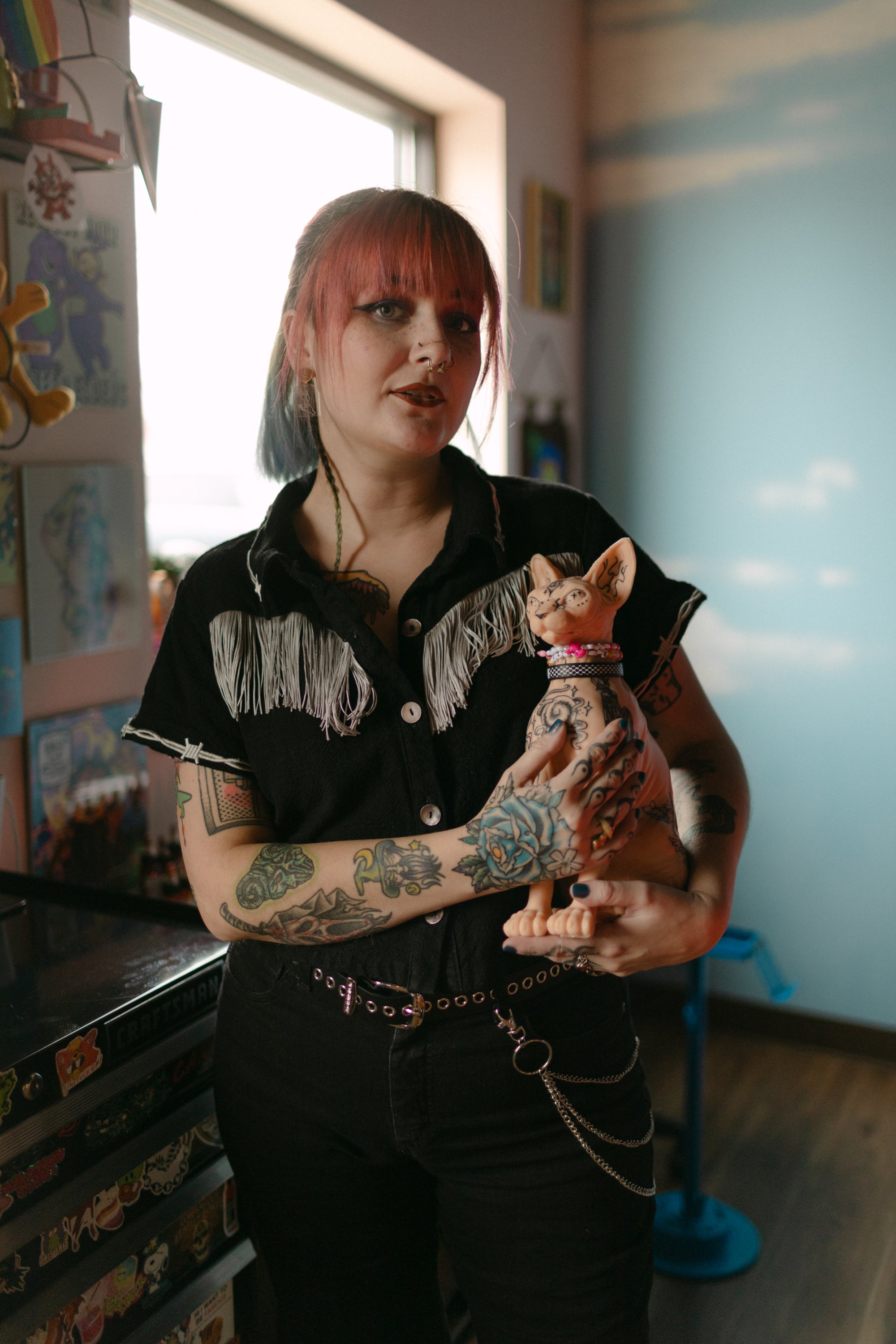 Meet Kitty (she/her): Kitty started her tattoo journey in 2022. Her passion for art has always been a part of life and she is excited to share that with everyone! Her style is eclectic with traditional elements inspired by her interests, especially pop culture. She hopes to create a safe and inclusive space for all identities and bodies!